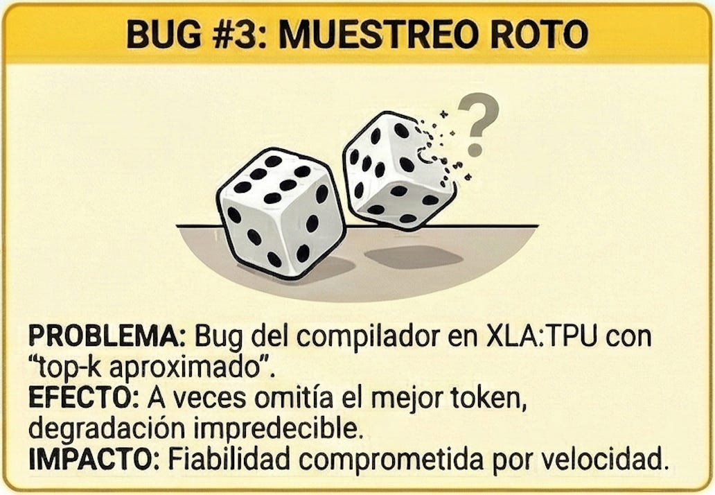 Claude usaba “approximate top-k” para generar tokens rápido en TPU. Pero al refactorizar ese módulo, apareció un bug en el compilador XLA:TPU que rompía la precisión.
