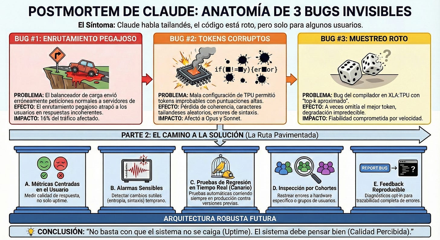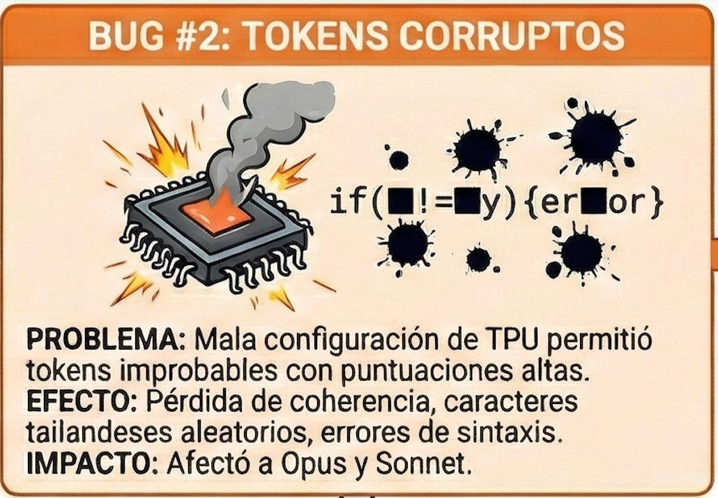 Una mala configuración en los servidores TPU provocó que Claude generara tokens con probabilidades erráticas. Aparecían caracteres tailandeses en prompts en inglés, o código con errores obvios de sintaxis.
