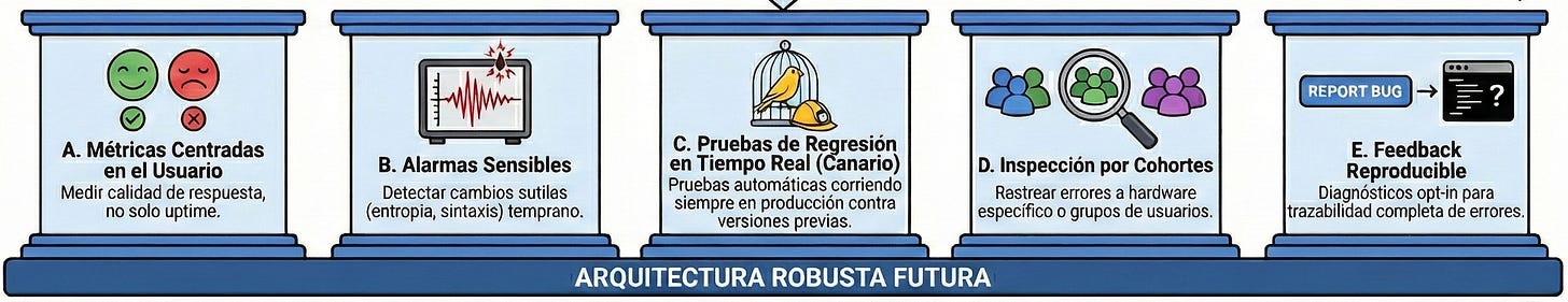 Capacidad de inspeccionar degradaciones por cohortes. Qué porcentaje de usuarios están viendo respuestas rotas, y si vienen del mismo pool o hardware. No tenían trazabilidad en una arquitectura muy heterogénea y con muchos componentes
