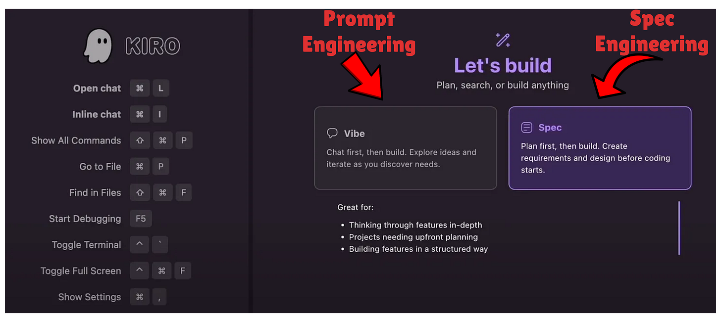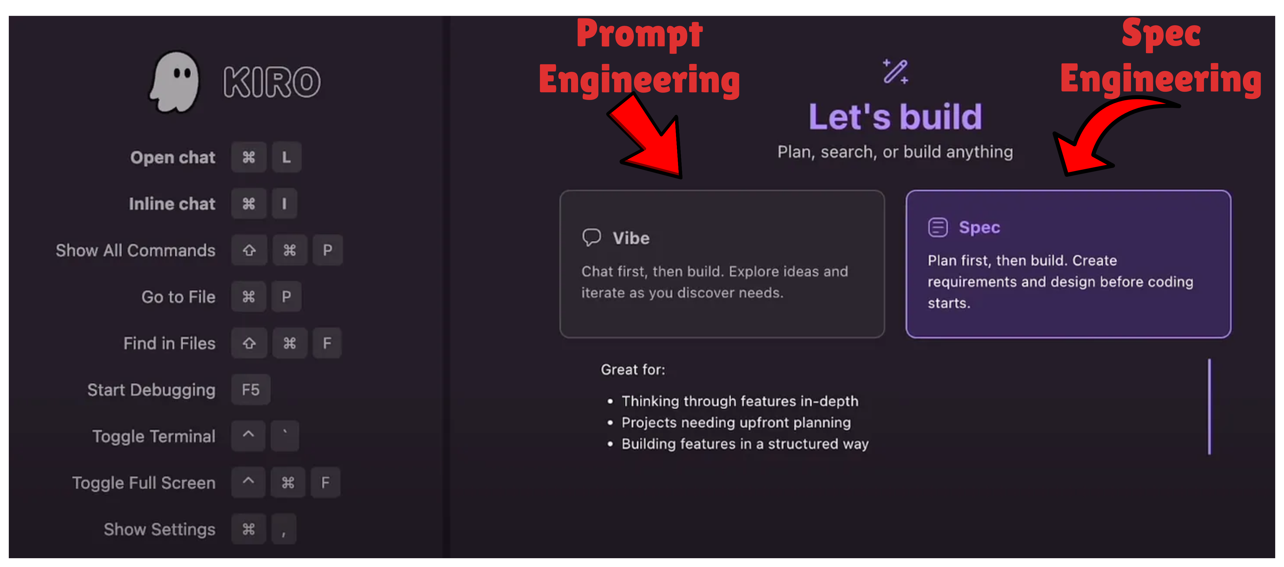 Confiar solo en el “vibe coding” básico (Prompt Engineering) es rápido para tareas pequeñas, pero se encuentra con un límite en proyectos complejos. Nuevos IDEs como Kiro de Amazon están adoptando lo que se llama Desarrollo Guiado por Especificaciones (Spec-Driven Development).