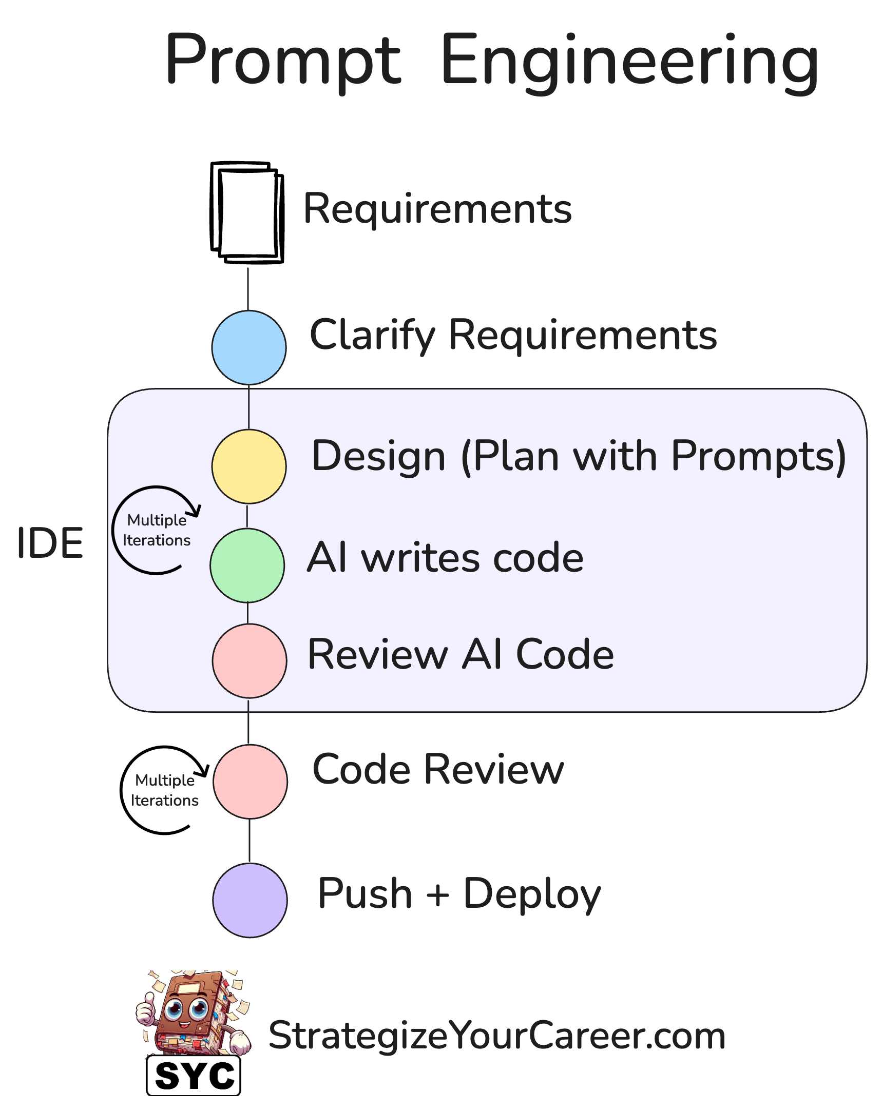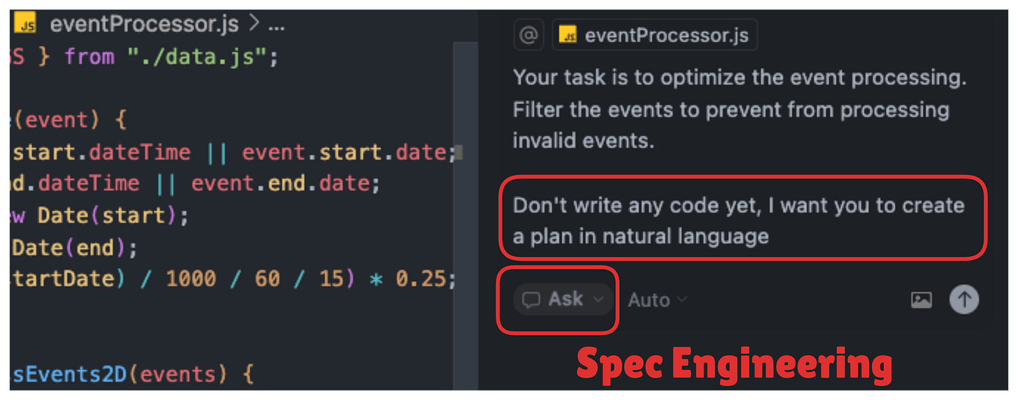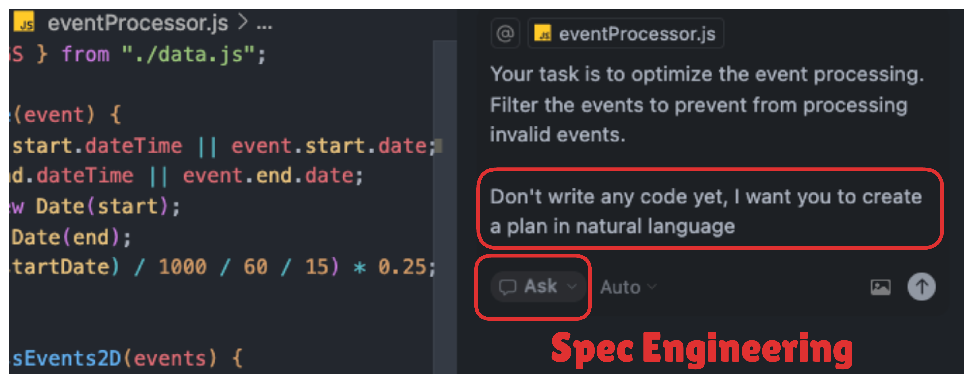 Prompt Engineering es conversacional. No estás planeando una solución perfecta. Haces una solicitud acotada y iteras según el resultado. Usas comandos inline como “refactoriza esto” o “agrega verificación de valores nulos”, y la IA edita directamente en tu código.